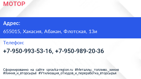 МОТОР по адресу 655015, Хакасия, Абакан, Флотская, 13и в дальнейшем Организация, размещена в следующих категориях: