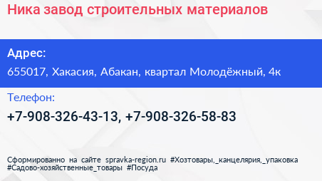 Ника, завод строительных материалов по адресу 655017, Хакасия, Абакан, квартал Молодёжный, 4к в дальнейшем Организация, размещена в следующих категориях: