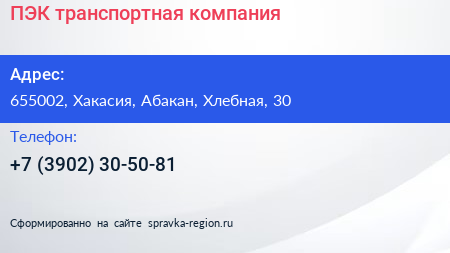 ПЭК, транспортная компания по адресу 655002, Хакасия, Абакан, Хлебная, 30 в дальнейшем Организация, размещена в следующих категориях: