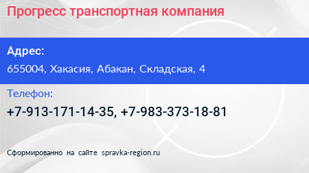 Прогресс, транспортная компания по адресу 655004, Хакасия, Абакан, Складская, 4 в дальнейшем Организация, размещена в следующих категориях: