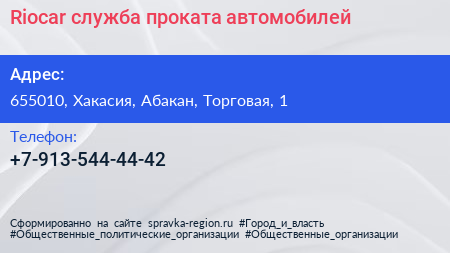 Riocar, служба проката автомобилей по адресу 655010, Хакасия, Абакан, Торговая, 1 в дальнейшем Организация, размещена в следующих категориях: