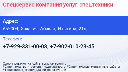Спецсервис, компания услуг спецтехники по адресу 655004, Хакасия, Абакан, Итыгина, 21д в дальнейшем Организация, размещена в следующих категориях: