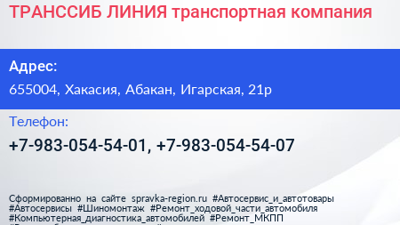 ТРАНССИБ ЛИНИЯ, транспортная компания по адресу 655004, Хакасия, Абакан, Игарская, 21р в дальнейшем Организация, размещена в следующих категориях: