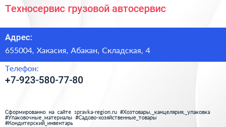 Техносервис, грузовой автосервис по адресу 655004, Хакасия, Абакан, Складская, 4 в дальнейшем Организация, размещена в следующих категориях:
