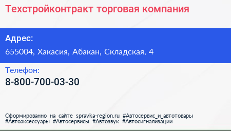 Техстройконтракт, торговая компания по адресу 655004, Хакасия, Абакан, Складская, 4 в дальнейшем Организация, размещена в следующих категориях: