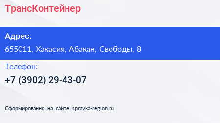 ТрансКонтейнер по адресу 655011, Хакасия, Абакан, Свободы, 8 в дальнейшем Организация, размещена в следующих категориях: