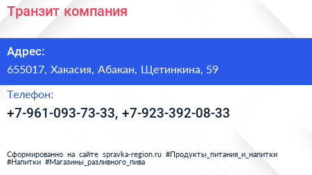 Транзит, компания по адресу 655017, Хакасия, Абакан, Щетинкина, 59 в дальнейшем Организация, размещена в следующих категориях: