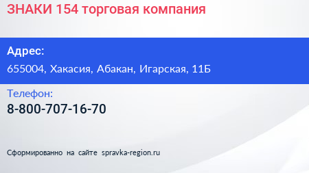 ЗНАКИ 154, торговая компания по адресу 655004, Хакасия, Абакан, Игарская, 11Б в дальнейшем Организация, размещена в следующих категориях: