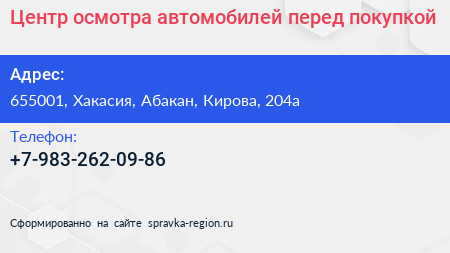 Центр осмотра автомобилей перед покупкой по адресу 655001, Хакасия, Абакан, Кирова, 204а в дальнейшем Организация, размещена в следующих категориях: