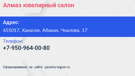 Алмаз, ювелирный салон по адресу 655017, Хакасия, Абакан, Чкалова, 17 в дальнейшем Организация, размещена в следующих категориях: