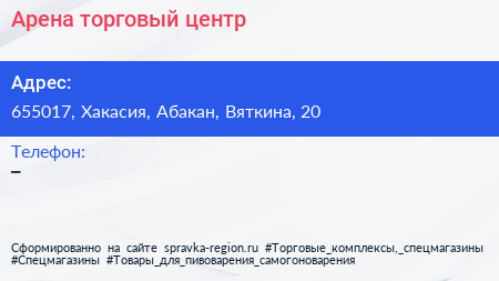 Арена, торговый центр по адресу 655017, Хакасия, Абакан, Вяткина, 20 в дальнейшем Организация, размещена в следующих категориях: