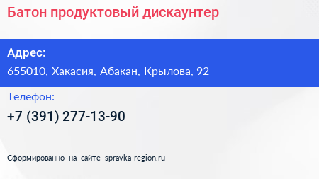 Батон, продуктовый дискаунтер по адресу 655010, Хакасия, Абакан, Крылова, 92 в дальнейшем Организация, размещена в следующих категориях: