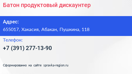 Батон, продуктовый дискаунтер по адресу 655017, Хакасия, Абакан, Пушкина, 118 в дальнейшем Организация, размещена в следующих категориях: