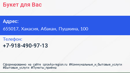 Букет для Вас по адресу 655017, Хакасия, Абакан, Пушкина, 100 в дальнейшем Организация, размещена в следующих категориях: