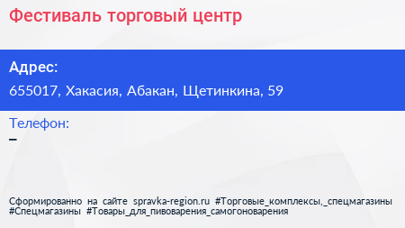 Фестиваль, торговый центр по адресу 655017, Хакасия, Абакан, Щетинкина, 59 в дальнейшем Организация, размещена в следующих категориях: