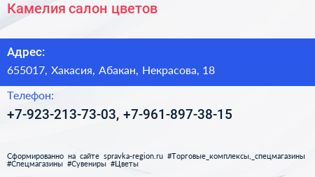 Камелия, салон цветов по адресу 655017, Хакасия, Абакан, Некрасова, 18 в дальнейшем Организация, размещена в следующих категориях: