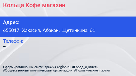 Кольца.Кофе, магазин по адресу 655017, Хакасия, Абакан, Щетинкина, 61 в дальнейшем Организация, размещена в следующих категориях: