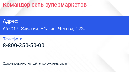 Командор, сеть супермаркетов по адресу 655017, Хакасия, Абакан, Чехова, 122а в дальнейшем Организация, размещена в следующих категориях: