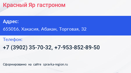 Красный Яр, гастроном по адресу 655016, Хакасия, Абакан, Торговая, 32 в дальнейшем Организация, размещена в следующих категориях: