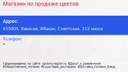 Магазин по продаже цветов по адресу 655004, Хакасия, Абакан, Советская, 113 киоск в дальнейшем Организация, размещена в следующих категориях: