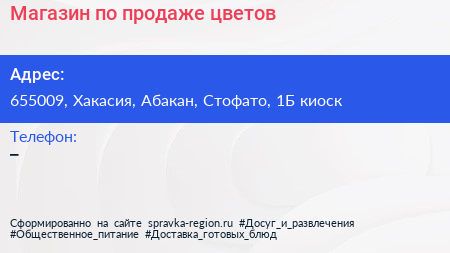 Магазин по продаже цветов по адресу 655009, Хакасия, Абакан, Стофато, 1Б киоск в дальнейшем Организация, размещена в следующих категориях: