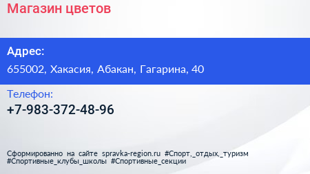 Магазин цветов по адресу 655002, Хакасия, Абакан, Гагарина, 40 в дальнейшем Организация, размещена в следующих категориях: