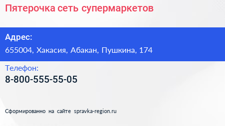 Пятерочка, сеть супермаркетов по адресу 655004, Хакасия, Абакан, Пушкина, 174 в дальнейшем Организация, размещена в следующих категориях: