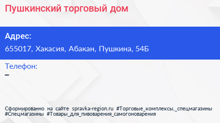 Пушкинский, торговый дом по адресу 655017, Хакасия, Абакан, Пушкина, 54Б в дальнейшем Организация, размещена в следующих категориях: