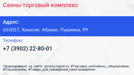 Саяны, торговый комплекс по адресу 655017, Хакасия, Абакан, Пушкина, 99 в дальнейшем Организация, размещена в следующих категориях: