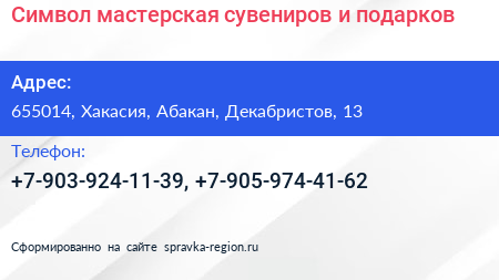 Символ, мастерская сувениров и подарков по адресу 655014, Хакасия, Абакан, Декабристов, 13 в дальнейшем Организация, размещена в следующих категориях: