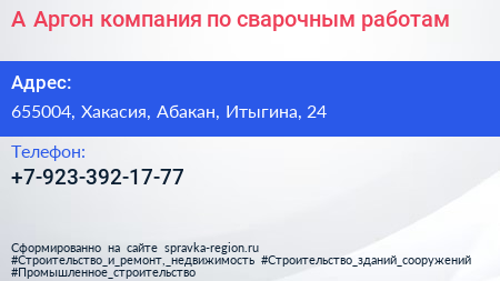 А Аргон, компания по сварочным работам по адресу 655004, Хакасия, Абакан, Итыгина, 24 в дальнейшем Организация, размещена в следующих категориях: