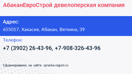 АбаканЕвроСтрой, девелоперская компания по адресу 655017, Хакасия, Абакан, Вяткина, 39 в дальнейшем Организация, размещена в следующих категориях: