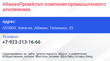 АбаканПромАльп, компания промышленного альпинизма по адресу 655003, Хакасия, Абакан, Тельмана, 25 в дальнейшем Организация, размещена в следующих категориях: