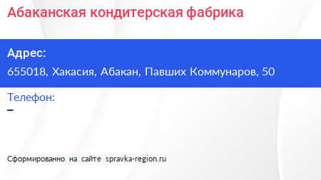 Абаканская, кондитерская фабрика по адресу 655018, Хакасия, Абакан, Павших Коммунаров, 50 в дальнейшем Организация, размещена в следующих категориях:
