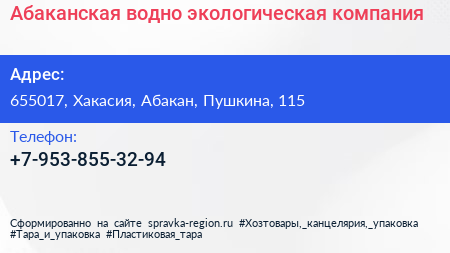 Абаканская водно-экологическая компания по адресу 655017, Хакасия, Абакан, Пушкина, 115 в дальнейшем Организация, размещена в следующих категориях: