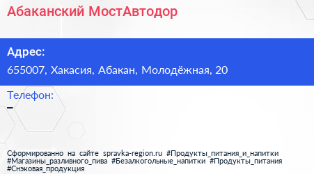 Абаканский МостАвтодор по адресу 655007, Хакасия, Абакан, Молодёжная, 20 в дальнейшем Организация, размещена в следующих категориях: