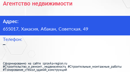 Агентство недвижимости по адресу 655017, Хакасия, Абакан, Советская, 49 в дальнейшем Организация, размещена в следующих категориях: