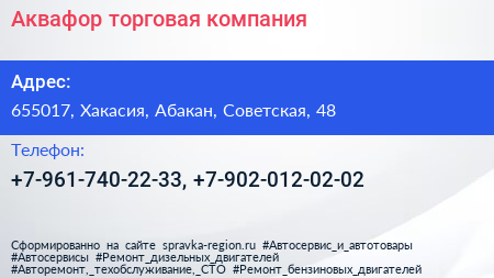 Аквафор, торговая компания по адресу 655017, Хакасия, Абакан, Советская, 48 в дальнейшем Организация, размещена в следующих категориях: