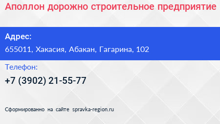 Аполлон, дорожно-строительное предприятие по адресу 655011, Хакасия, Абакан, Гагарина, 102 в дальнейшем Организация, размещена в следующих категориях: