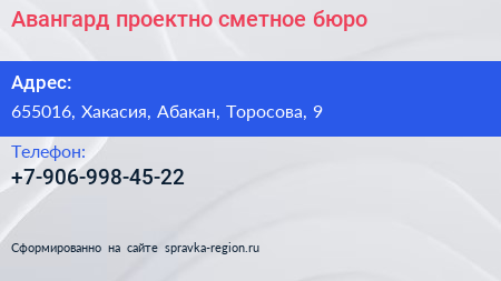Авангард, проектно-сметное бюро по адресу 655016, Хакасия, Абакан, Торосова, 9 в дальнейшем Организация, размещена в следующих категориях: