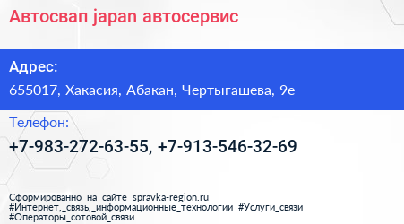 Автосвап japan, автосервис по адресу 655017, Хакасия, Абакан, Чертыгашева, 9е в дальнейшем Организация, размещена в следующих категориях: