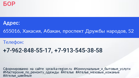 БОР по адресу 655016, Хакасия, Абакан, проспект Дружбы народов, 52 в дальнейшем Организация, размещена в следующих категориях: