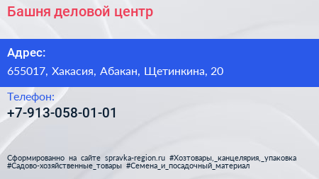 Башня, деловой центр по адресу 655017, Хакасия, Абакан, Щетинкина, 20 в дальнейшем Организация, размещена в следующих категориях: