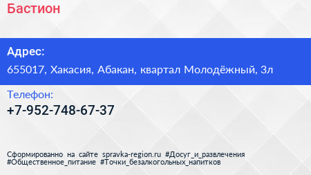 Бастион по адресу 655017, Хакасия, Абакан, квартал Молодёжный, 3л в дальнейшем Организация, размещена в следующих категориях: