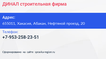 ДИНАЛ, строительная фирма по адресу 655011, Хакасия, Абакан, Нефтяной проезд, 20 в дальнейшем Организация, размещена в следующих категориях: