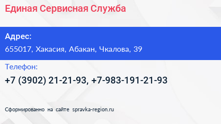 Единая Сервисная Служба по адресу 655017, Хакасия, Абакан, Чкалова, 39 в дальнейшем Организация, размещена в следующих категориях: