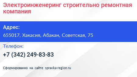 Электроинженеринг, строительно-ремонтная компания по адресу 655017, Хакасия, Абакан, Советская, 75 в дальнейшем Организация, размещена в следующих категориях: