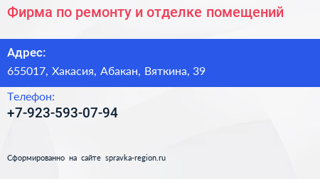 Фирма по ремонту и отделке помещений по адресу 655017, Хакасия, Абакан, Вяткина, 39 в дальнейшем Организация, размещена в следующих категориях: