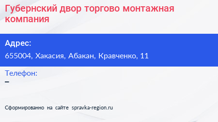Губернский двор, торгово-монтажная компания по адресу 655004, Хакасия, Абакан, Кравченко, 11 в дальнейшем Организация, размещена в следующих категориях: