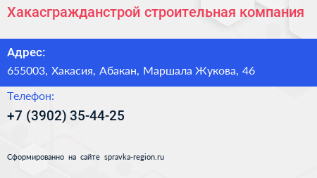 Хакасгражданстрой, строительная компания по адресу 655003, Хакасия, Абакан, Маршала Жукова, 46 в дальнейшем Организация, размещена в следующих категориях: